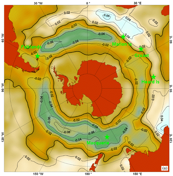 A study of southern ocean temperatures for the period of 1982 – 2005 (“Interannual trends in the Southern Ocean sea surface temperature and sea level from remote sensing data”, by S. A. Lebedev , Russian Academy of Sciences, published in the RUSSIAN JOURNAL OF EARTH SCIENCES, VOL. 9, 2007 [http://elpub.wdcb.ru/journals/rjes/v09/2007ES000283/2007ES000283.pdf]) provides the following figure showing sea surface temperature trends. The green stars and labels indicate the five main King penguin colony islands.