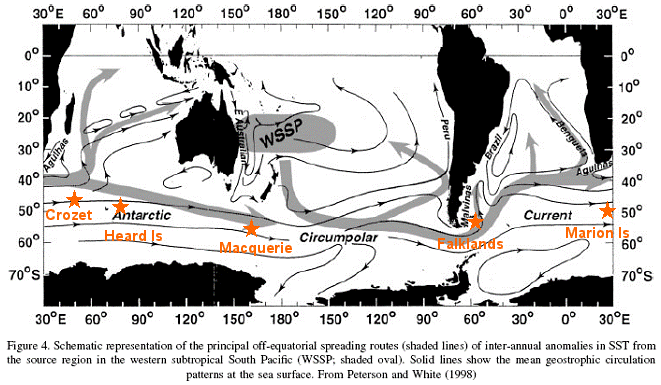 Some of the breeding islands are affected by warming due to currents from El Nino. The following figure (from “The El Nino–Southern Oscillation and Antarctica” by John Turner of the Antarctic Survey, UK National Environment Research Council, International Journal of Climatology, 2004 [http://www.scar.org/information/elnino/El_Nino.pdf]) shows the warming currents resulting from El Nino. The orange stars and labels indicate the five main King penguin colony islands. The next figure is from the same study and shows the strong correlation between sea surface temperature anomalies in the Ross Sea (south of Macquerie) and the El Nino region (in the Pacific ocean around the equator).