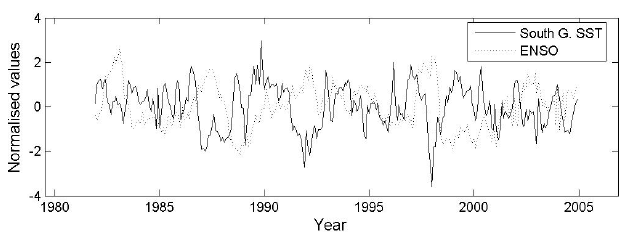 A recent study (“On the Interannual Variability of Ocean Temperatures Around South Georgia, Southern Ocean: Forcing by El Niño/Southern Oscillation and the Southern Annular Mode” by Michael P. Meredith, Eugene J. Murphy, Elizabeth J. Hawker, John C. King and Margaret I. Wallace, of the British Antarctic Survey [http://nora.nerc.ac.uk/1682/1/Meredith_et_al_double_spaced_with_figs.pdf]) provides the following figure of normalized sea surface temperature anomalies (and compared to the southern oscillation) for South Georgia Island (east of the Falklands, north of the Weddell Sea). This shows more recent cooling from the end of the previous figure and indicates a slight cooling trend over the last two decades.