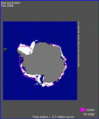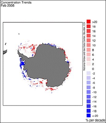 The following figures are from the National Snow and Ice Data Center [http://nsidc.org/data/seaice_index]. The left figure shows the sea ice extent (February 2008) compared with the median ice edge (magenta line). The Weddell Sea Ice Shelf (upper left corner of Antarctica), which is where the largest distribution of krill is, has been expanding. This is confirmed by the figure on the right, showing the sea ice concentration trends with red indicating increasing ice concentration. The only area with sea ice decline is the west coast of the Antarctic Peninsula.