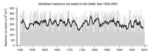 The following figure is from Figure 3 from their paper, showing reconstructed and modeled maximum ice extent of the Baltic Sea. They state: “The 1730s is the decade with the least ice, followed by the 1740s and the 1930s. …Bearing in mind that the LIA, with a generally colder climate, ended in the 1870’s” any reduction in sea ice in the century that followed would be expected.”
