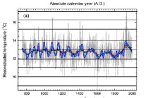 The following figure shows reconstructed summer temperature data for the last 1,300 years (gray) with smoothed data at the decadal, multi-decadal, centennial, and multi-centennial time frames. The authors wrote “The warmest and coldest reconstructed 250-year periods occurred AD 931-1180 and AD 1601-1850. These periods overlap with the Medieval Warm Period (MWP) and the Little Ice Age (LIA). The coldest and warmest of all reconstructed 100-year periods occurred AD 1587-1686 and AD 1895-1994, respectively.”