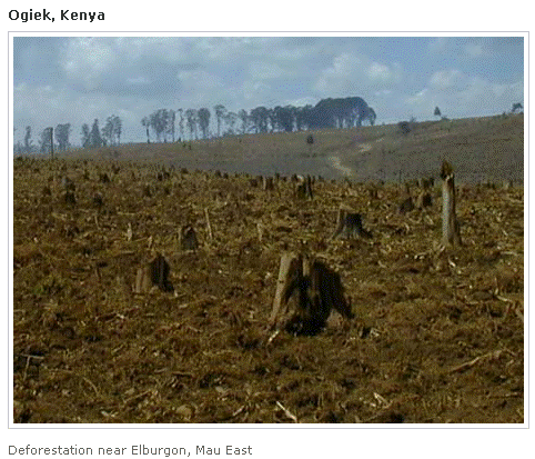 “The deforestation that has occurred in Mt Kenya, Mau, Aberdare, Mt Elgon and Kaptagat forests has negatively affected watersheds. Due to the loss of forest cover, the ability of water catchment areas to regulate run-off has been reduced, with subsequent flooding. The area under forest cover has rapidly diminished from 165,000 hectares in 1988 to 80,000 hectares in 2003.”[http://www.rio10.dk/index.php?a=show&doc_id=1846]