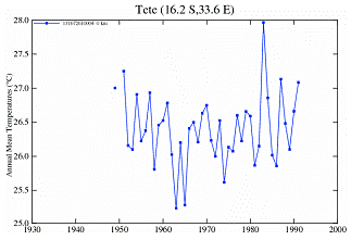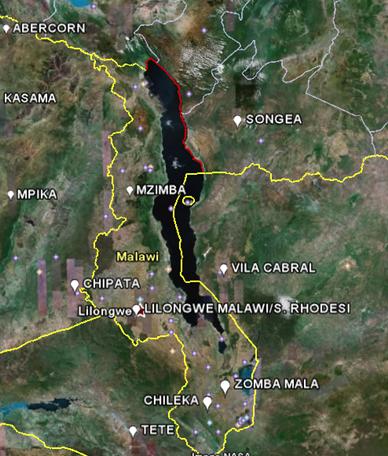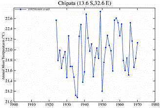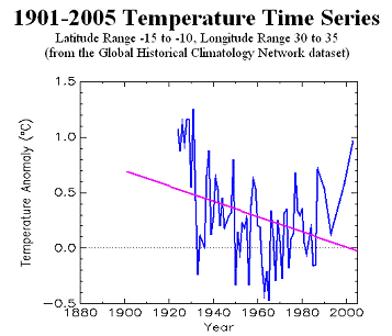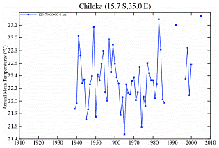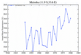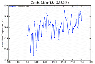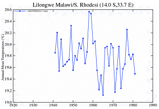 The following figure shows the temperature stations in the NASA / GISS database. There are no long-term continuous temperature stations in Malawi. (Chipata and Tete are also shown even though they are not in Malawi – they are in the same vicinity).