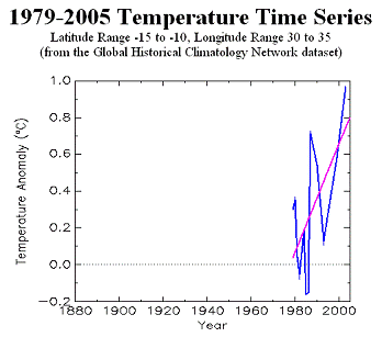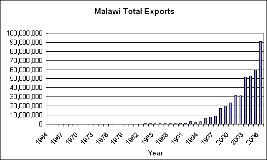 The following figure shows Malawi total exports from 1964 to 2006 (in 000’s of Kwacha). (Data from the National Statistical Office of Malawi [http://www.nso.malawi.net/]. Since 80 percent of Malawi’s exports are agricultural it appears that the current warming trend is having a positive impact.