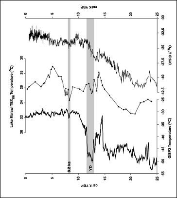 The following figure shows long-term temperature reconstruction from Lake Malawi sediments from “Holocene Climate in Tropical Africa – Recent Results” by T. C Johnson (Large Lakes Observatory, University of Minnesota) [http://www.mesh.usc.edu/files/HPIM_Research_Summaries.pdf]. Temperatures have declined by 3 degrees over the last 5 thousand years (indicated in circled part of graph).