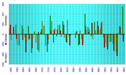 Malawi is susceptible to wide variations in rainfall. The following figure shows precipitation anomalies from 1960 to 1996 (from EASD referenced above).