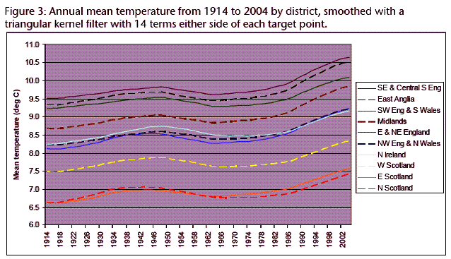 The UK Meteorological Office collects data (in association with the Hadley center) from more stations and provides a summary report of trends. [http://www.metoffice.gov.uk/climate/uk/about/UK_climate_trends.pdf]. The following figure is from that report, and shows temperature trends from 1914 to 2004 for the UK. It is interesting to note that the recent warming trend only began in 1989. This is especially interesting given that the IPCC was started in 1988 with the stated purpose of assessing “the scientific, technical and socioeconomic information relevant for the understanding of the risk of human-induced climate change.” So the IPCC already knew that human-induced climate change was happening in 1988, and their data is provided by the Hadley center in the UK, but warming doesn’t even start in the UK data until 1989.