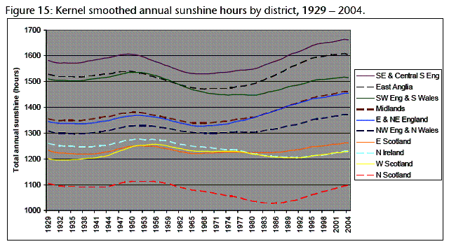The UK Met Office report states: “Winter and autumn sunshine has increased very significantly for northern, central and south-east England since 1929… Most of the increase has taken place since the late 1960’s.” The following figures show annual smoothed temperatures and sunshine hours by district. Could the sunshine be causing warming?