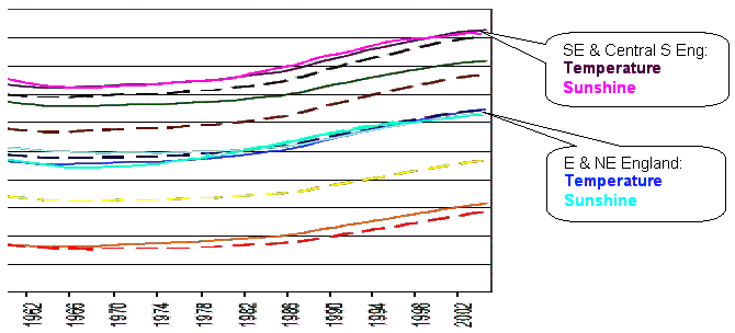The following figure shows the temperature data from above plus two of the sunshine data lines from above, for 1960 to 2004. The two comparison curves are for “SE & Central S Eng” and “E & NE England”. Most of the temperature curves show similar almost exact correspondence with sunshine. The averaged regional temperature shows a better correlation with solar than with CO2.