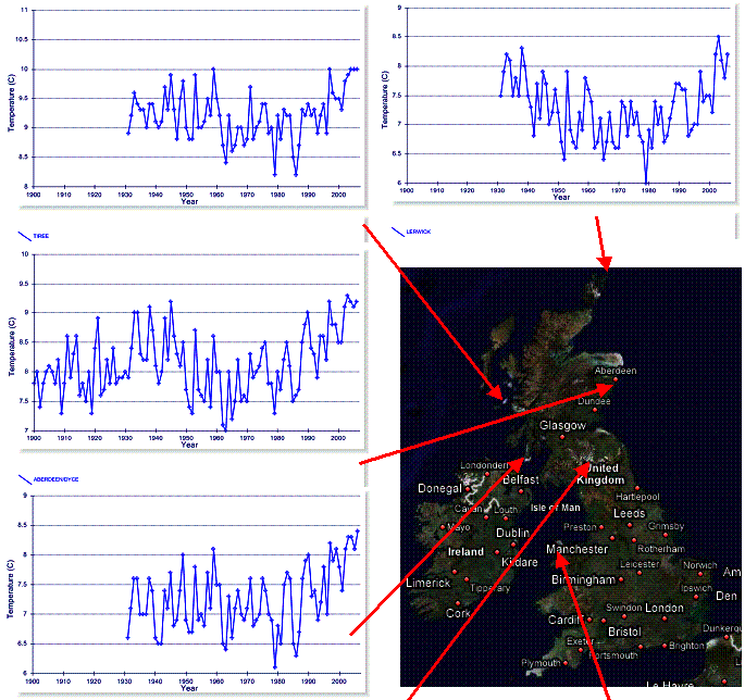 There are only 7 temperature stations in the NOAA GHCN database that have data before 1940 as well as after 200 in the UK. The following figure shows the mean annual temperature data from six of these stations (the seventh – Stornoway – is very similar to Lerwick). Lerwick and Stornoway are the two northern-most stations – on islands off the coast of northern Scotland.