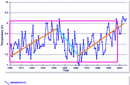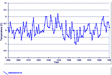 However looking at the same Aberdeen data using a different year range gives a very different picture. The following figure shows Aberdeen mean annual temperature for 1896 to 1996 – there is no observed long-term trend.