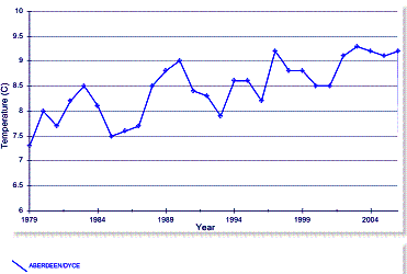 Aberdeen is also a good case study of choosing a year range. The IPCC (AR4) uses a starting point of 1979 for climate summaries (even though 1979 – 2005 is shorter than the standard definition of climate). The figure below left is from the AR4 Figure 9.6 showing significant warming in the UK region. The figure below right shows the Aberdeen mean annual temperature for 1979 – 2006 (same GHCN data as shown above).