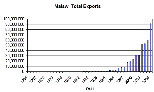 An example of “declining crop yields” -- of course not Malawi: The following figure shows Malawi total exports from 1964 to 2006 (in 000’s of Kwacha). (Data from the National Statistical Office of Malawi [http://www.nso.malawi.net/]. Since 80 percent of Malawi’s exports are agricultural it appears that the current “warming trend” is having a positive impact.