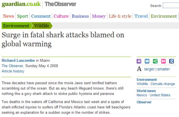 The Guardian promotes global warming hysteria with articles that have no rational basis. Quoting ‘experts’: “Another contributory factor to the location of shark attacks could be global warming and rising sea temperatures”