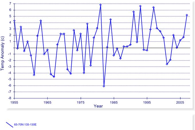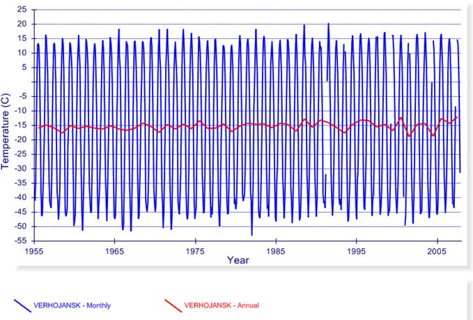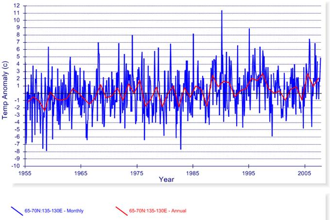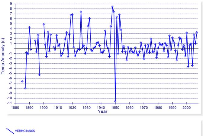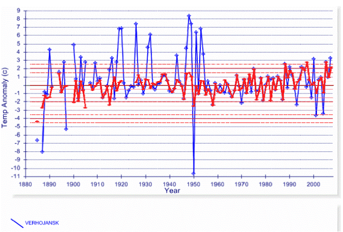 Below: Comparison of annual temperature anomaly: HadCRU 65-70N x 130-135E grid (red) NOAA Verhojansk (blue)
