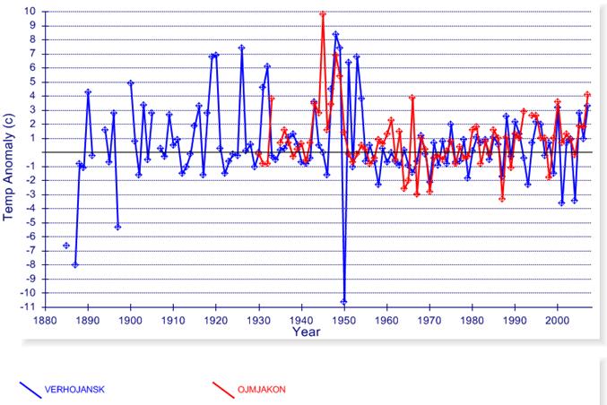 Below: Comparison of Verhodansk (blue) and Ojmjakon (red) mean annual temperature anomaly (NOAA database)