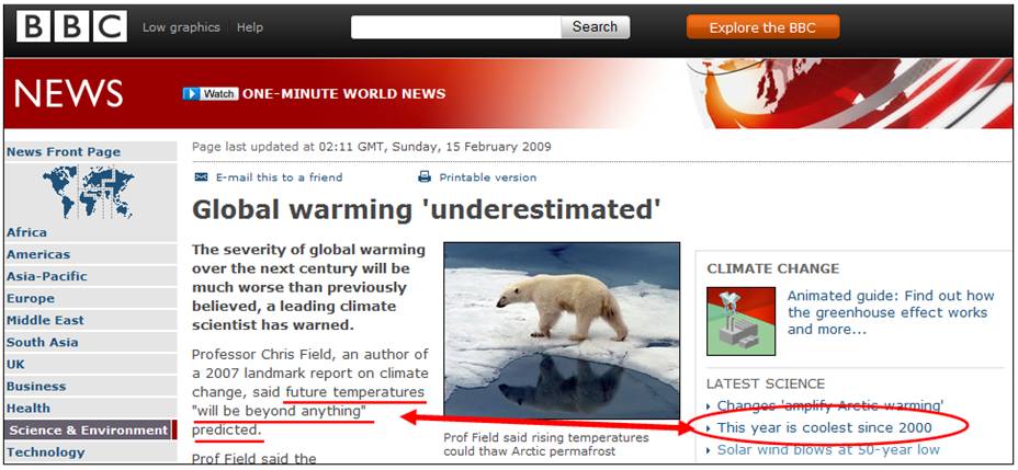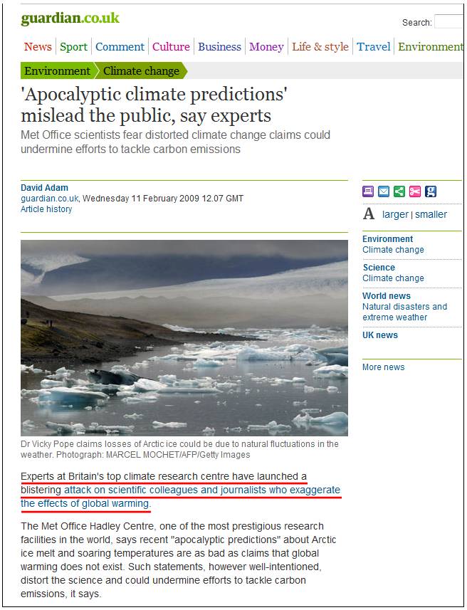 The Guardian (11 Feb 2009) [http://www.guardian.co.uk/environment/2009/feb/11/climate-change-misleading-claims] needed counteracting by the BBC for trying to reduce the alarm: