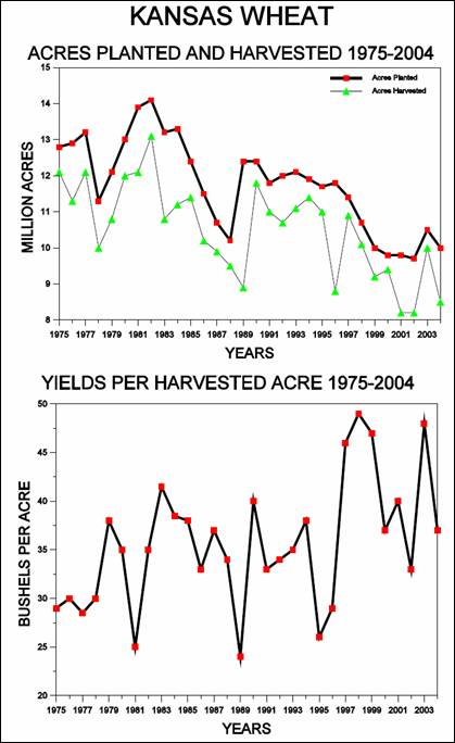 The United States is one of the world’s largest wheat producers and exporters. Kansas has traditionally been the largest wheat producing state in the US. The following figure shows Kansas wheat planted (upper graph) and yield per acre (lower graph) from 1975 to 2004. [http://www.nass.usda.gov/ks/whthist/whthist.pdf]