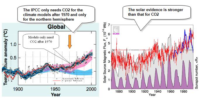 The following figure compares three figures from the IPCC 2007 Physical Basis for Climate Change report [Ref.2]. It shows a) the total solar irradiance and b) compares that with the temperature trend, as well as c) comparing the solar irradiance with the computer models. This deficiency of the computer models results in the deviation displayed in the right-hand figure, i.e. the models do not account for solar irradiance because the mechanism is as yet not understood and is therefore not incorporated in the models.