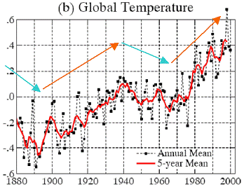Other regions of the world also exhibit wide variations in temperature trends – the warming is generally a northern hemisphere phenomenon. The following figure shows plots comparing regional temperature trends for a) Southern Australia with Southern Africa, and b) Northern Europe with Northern Canada. The southern hemisphere regions exhibit warming that is still below temperatures in the early 1900’s, whereas the northern hemisphere regions show a warming trend that exhibits variations on a scale that exceed the total warming.