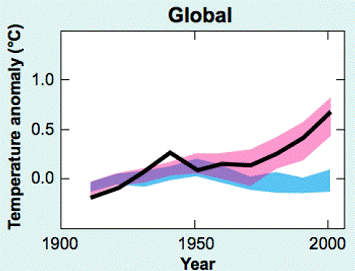 The following figure is from the IPCC 2007 Summary for Policymakers Figure SPM-4 showing the results of climate model simulations. It compares decadal temperature averages (black line) with the result of model simulations. The lower (blue) band shows the results of model simulations using only the natural forcings due to solar activity and volcanoes. The upper (pink) bands matching the temperature lines show the results of model simulations including anthropogenic CO2.