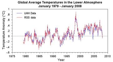 The next pair of figures show global temperature data from 2002 to 2008. The figure below left compares the Hadley Climatic Research Unit with the NASA GISS surface station data. The right-hand figure shows the satellite-based data as process by UAH and RSS. In all data sets there is an absence of increased warming trends.