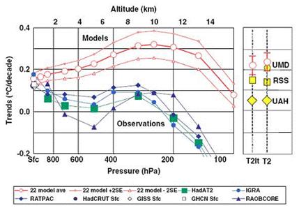 A study comparing the models to observations from satellites and balloons (1979-2004) also shows a problem with the models. The following figure is from the study. “A comparison of tropical temperature trends with model predictions”, by Douglass, D.H., J.R. Christy, B.D. Pearson, and S.F. Singer, 2007 - International Journal of Climatology. [http://www.scribd.com/doc/904914/A-comparison-of-tropical-temperature-trends-with-model-predictions]. The models exhibit the CO2 theory of most warming occurring in the troposphere. However, the satellite and balloon based observations show warming only at the surface of the earth. The report stated: “Model results and observed temperature trends are in disagreement in most of the tropical troposphere, being separated by more than twice the uncertainty of the model mean. … On the whole, the evidence indicates that model trends in the troposphere are very likely inconsistent with observations that indicate that, since 1979, there is no significant long-term amplification factor relative to the surface. If these results continue to be supported, then future projections of temperature change, as depicted in the present suite of climate models, are likely too high.”