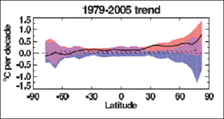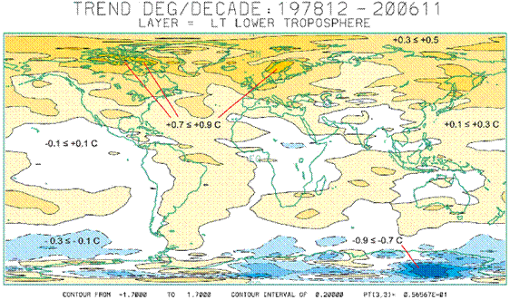 The University of Alabama at Huntsville provides monthly plots of worldwide temperature anomalies for the troposphere since 2000 [http://climate.uah.edu/]. The following figure is from UAH and shows the temperature trend (degrees per decade) for 1978 to 2006. According to the CO2 theory, warming should be occurring over both poles – but this is not happening.