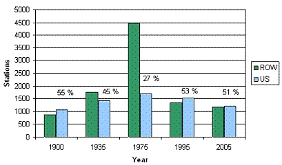 Stations in U.S. v Rest of World (ROW) For Various Years