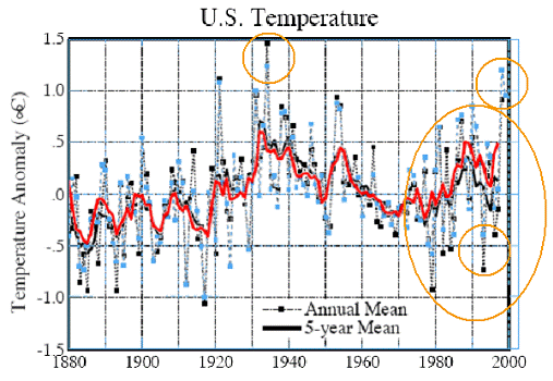 The following figure shows the temperature trend for the United States. The left-hand figure shows the annual average temperatures (black) along with the 5-year average (red) and the 5-year average of the global average temperature (blue) [Ref. 20]. The right-hand figure compares the US data with the IPCC global average figure. As can be seen, the United States exhibits significantly more variation than the global average; the temperature increase in the US is similar to the 1930’s.