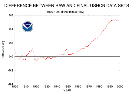 NOAA provides a summary of the adjustments made to the USHCN temperature data as shown in the following figure. [http://www.ncdc.noaa.gov/oa/climate/research/ushcn/ushcn.html] The report states: “The cumulative effect of all adjustments is approximately a one-half degree Fahrenheit warming in the annual time series over a 50-year period from the 1940's until the last decade of the century.” This is similar to the total amount of warming “observed”.