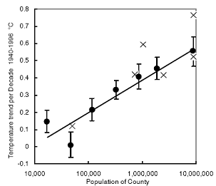 The temperature station site and whether it is urban or rural has a great effect on the temperature trend (although this is downplayed by the IPCC saying that adjustments take care of it). The following figure shows a plot of temperature increase rate versus population for California [Ref.21] illustrating the urban heat island effect.