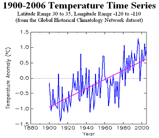 Within the United States (as in the rest of the world) there is significant regional variation in trends. The following figures show the two extremes. The central US (dustbowl area of the 1930’s) still does not have temperatures as high as the 1930’s. The Southern California / Arizona region includes mostly urban stations, including the top urban growth centers (including Los Angeles, Phoenix and Las Vegas).