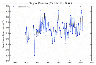 Temperature Trend for (urban) Los Angeles (left) and (rural) Tejon Rancho (right)
