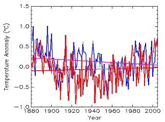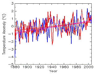 Regional Temperature Trends [left] Comparing Southern Australia (red) with Southern Africa (blue), and [right] Comparing Northern Europe (red) with Northern Canada (blue)