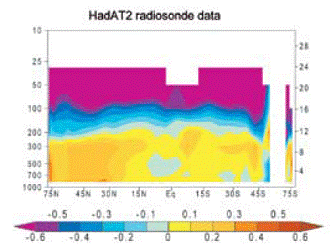 The IPCC 2007 Report Chapter 9 – Understanding and Attributing Climate Change [http://ipcc-wg1.ucar.edu/wg1/Report/AR4WG1_Print_Ch09.pdf] provides a climate model based simulation of the expected CO2 “spatial signature” of all forcings including anthropogenic CO2 (left-hand figure below shows degrees change per decade). However, a study of actual data from radiosonde data shows a non-CO2 based signature [http://www.templatelab.com/climatescience-sap1-finalreport/]. The models do not match reality.