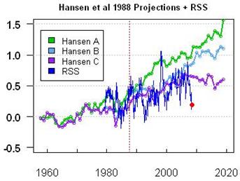 In 1988 NASA’s James Hansen provided temperature predictions based on climate models (which he presented to the US congress). He modeled three scenarios: A had an increasing rate of CO2 emissions, B had constant rate of CO2 of CO2 emissions, whereas scenario C had reduced CO2 emissions rate from 1988 levels into the future. The following figures compare Hansen’s 1988 predictions with actual temperature data since then. The left-hand figure compares the NASA GISS surface station data (as compiled by Hansen), while the right-hand figure compares the satellite-based temperature data as processed by RSS. (Figures from Steve McIntyre [http://www.climateaudit.org/?p=3354] ). While actual atmospheric CO2 levels have increased since 1988, the fact that actual temperatures are similar to the reduced CO2 models implies a problem with the models. (See www.appinsys.com/GlobalWarming/HansensPredictions1988.htm for further details on these model predictions.)