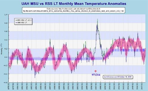 The following figure shows the general trends before and after the unusual 1997/98 El Nino superimposed on the satellite lower troposphere data. There was no warming trend before or after the El Nino, but a step resulting from the El Nino. [http://icecap.us/images/uploads/ThereWasNoGlobalWarmingBefore1997(February15th2009).pdf]