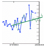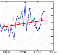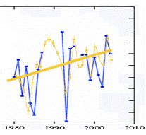 NASA started measuring the earth’s temperature by satellite microwave sounding unit in 1979. This provides less than 30 years’ data to the present, but allows some comparison with the surface station temperature measurements. The satellite data measured by NASA are processed at two locations: University of Alabama at Huntsville (UAH) and by RSS. The figure below left shows global lower atmosphere temperature from the satellite data. The right-hand plot compares the satellite data with the Hadley Climatic Research Unit data for the tropics. The 1998 spike was a severe El Nino.