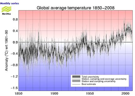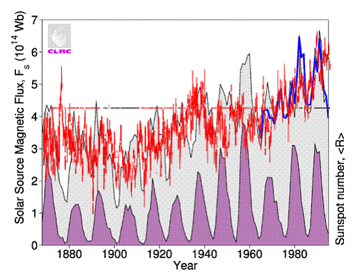 The following figures show the global average temperature from 1850 – 2008 (left) [http://hadobs.metoffice.com/hadcrut3/diagnostics/global/nh+sh/], and (right) the total solar magnetic flux (black line bounding grey shading and blue line) along with the annual sunspot number (shaded purple). The solar figure is from M. Lockwood, R. Stamper, and M.N. Wild: “A Doubling of the Sun's Coronal Magnetic Field during the Last 100 Years”, Nature Vol. 399, 3 June 1999 [http://www.ukssdc.ac.uk/wdcc1/papers/nature.html]) which states: “The magnetic flux in the solar corona has risen by 40% since 1964 and by a factor of 2.3 since 1901.”