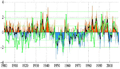 The following figure compares the correlation of temperature (green) for Western Washington and Oregon with the PDO (red / blue).