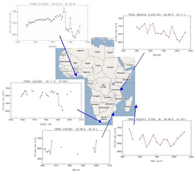 Sea levels have been falling in the 30 – 90 degree area northern hemisphere as the continents rebound from the last ice age. Slight rise has occurred as a result in some areas. Most of the world shows little or no change. The following figure shows the sea level rise around Africa.