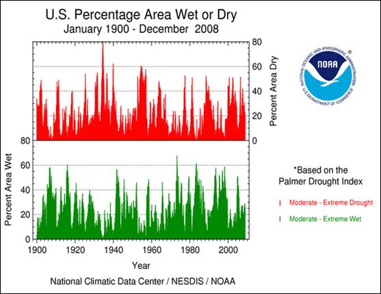 The following figure compares the occurrences of moderate to extreme drought and moderate to extreme wet conditions in the US for 1990 to 2008. Drought and wet are usually occurring somewhere, but no trend correlating to CO2.