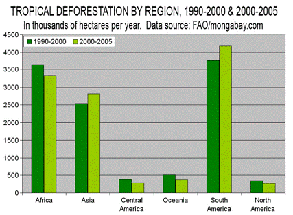 But the main problem with deforestation is not the CO2 - it’s the elimination of critical habitat in the most biologically diverse areas of the earth. It is also causing serious environmental consequences in those areas (decreased rainfall, increased flooding, increased warming) “An estimated 62 percent of precipitation occurs over land as a result of evapotranspiration from lakes and wetlands and dense vegetation, particularly forests, which pump ground water into the sky.” [Ref.31]. The following figure shows the major areas with deforestation. See www.appinsys.com/GlobalWarming/Deforestation.htm for more details.