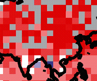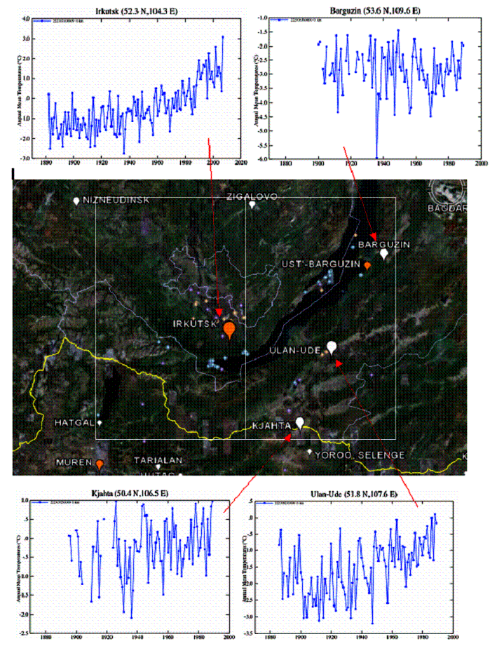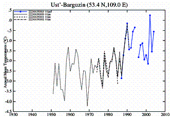 The following page shows the temperature stations in the two 5x5 degree grids (white rectangles indicate the grids). The problem observed for [50-55 lat, 100-105 long] (above-left) is that there is only one station – Irkutsk – an urban station, which shows continuous warming. The [50-55 lat, 105-110 long] (above-right) grid has more stations, which show no warming until the 1990’s – this is when all but one station stop. The only one (Ust Barguzin) is actually a combination of multiple sites. These two grids illustrate the problem of having only one station in a grid.