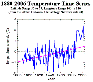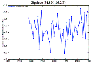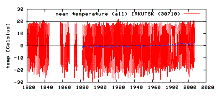 The following figure shows monthly averages for Irkutsk (red) with the annual average (blue). Most of this urban area warming is occurring in the winter months.